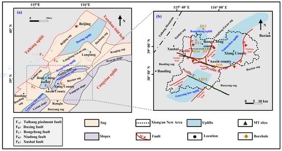 Tectonic map of the study area [20]. (a) Internal tectonic unit of the Jizhong depression [39]; (b) Locations of the MT survey points and geothermal boreholes and the geotectonic background of the Xiong’an New Area [40,41].