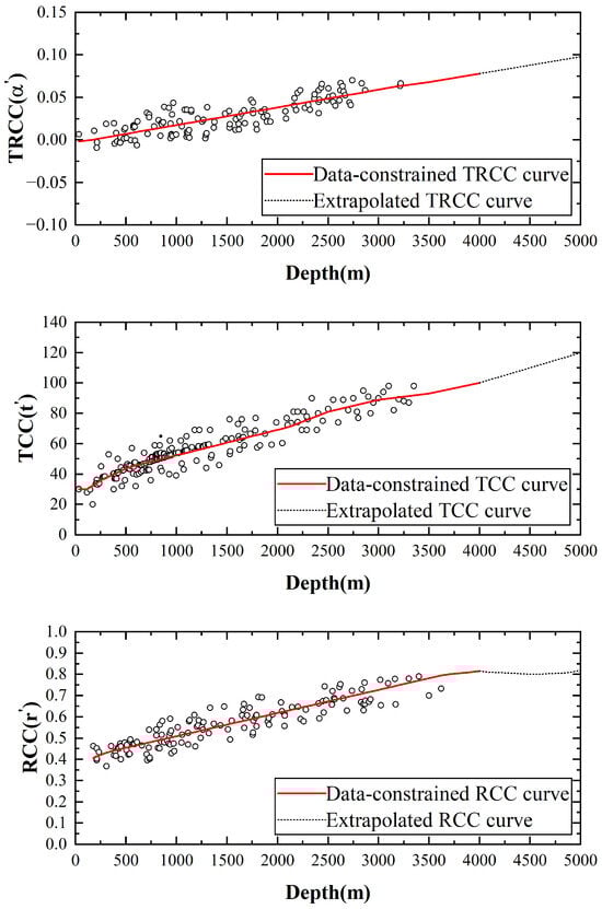 Step 2: On the basis of Equations (1) and (2) and the normalized resistivity–temperature datasets, the temperature compensation coefficient (TCC ), the resistivity compensation coefficient (RCC ), and the temperature–resistivity correction coefficient (TRCC ) between each measurement point are derived.