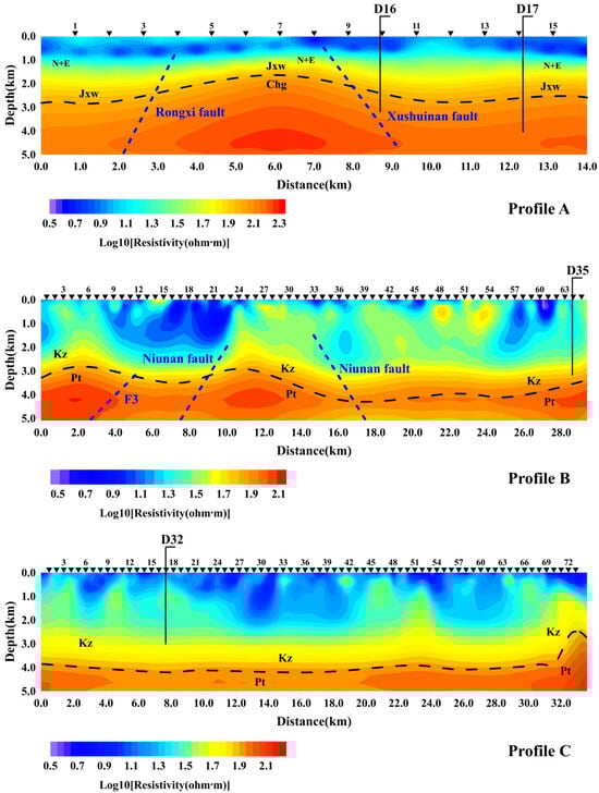 Inversion of the two-dimensional resistivity structure of three profiles in the Xiong’an New Area performed with the joint TE and TM models [20]. The black dashed line in Profile A indicates the boundary between the Jxw and Chg formations, and the black dashed lines in Profile B and C indicate the boundary between the Cenozoic formations (excluding the Quaternary) (Kz) and the Proterozoic formations (Pt). Note: The resistivity scale is chosen to show the full range of resistivity variations for better visualization of geological structures.