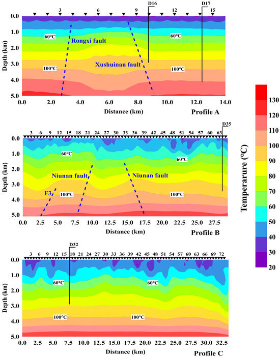 Profile C: Fault zones at deeper positions typically correspond to localized low-temperature areas (characterized by concave temperature fields), whereas the shallower parts of the fault zones correspond to localized high-temperature areas (characterized by convex temperature fields). In Profile A, the temperatures in deep regions between the Rongxi fault and the Xushuinan fault, as well as in the areas on either side of the fault zones, tend to decrease, whereas the temperatures in shallow regions tend to increase. In Profile B, the temperature field characteristics at fault zone F3 and the Niunan fault are consistent with this pattern. This conclusion aligns with the thermal convergence model in the theory of heat conduction, further indicating that these faults are important conduits for heat and water transfer in the geothermal system of the Xiong’an New Area.
