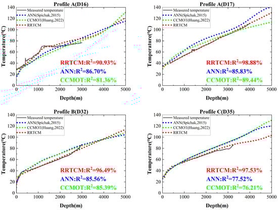 To validate the performance of the RRTCM, a comparative study was conducted against a well-established artificial neural network (ANN) method [17] and the CCMOT method proposed by Huang et al. [20]. Both methods were applied to predict temperature distributions in four validation boreholes (D16, D17, D32, and D35) under identical conditions. The ANN architecture was specifically designed for geothermal temperature prediction with the following: