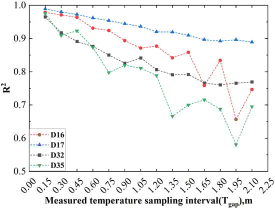 To study the effect of on the temperature prediction accuracy, we selected five fixed boreholes, D12, D16, D17, D32, and D35, as constrained boreholes and set the maximum depth of the constrained boreholes, , to 4000 m. The minimum value of was set to 0.15 m, and the maximum value was set to 2.1 m. Fourteen temperature predictions were made for each of the boreholes in incremental steps of 0.15 m. From the experiment we found that the temperature prediction accuracy is negatively correlated with when is less than 1.35 m and fluctuates with when is greater than 1.35 m (Figure 7). The highest temperature prediction accuracy was obtained for the four validation boreholes in the three profiles when was 0.15 m. Among these boreholes, the best temperature prediction was obtained for D17 in Profile A. When was 1.95 m, the lowest temperature prediction accuracy was obtained for D16 in Profile A and D35 in Profile B; when was 1.8 m, the lowest prediction accuracy was obtained for D17 in Profile A and D32 in Profile C. Thus, as the sampling interval increases, the amount of data involved in the calculations for the constrained boreholes decreases, thus introducing some errors. However, when is increased to a certain value, some anomalous measurement points in the logging data may be eliminated, thus improving the temperature prediction accuracy to some extent.
