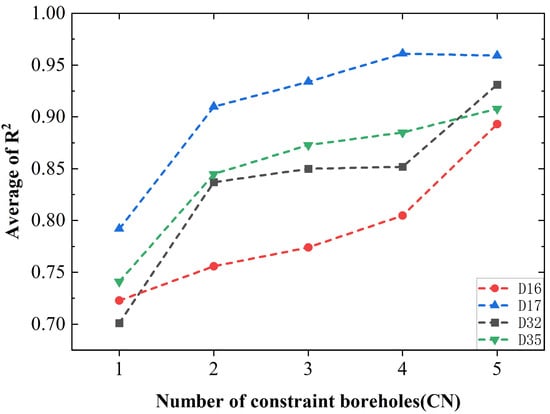 The R2 values of the predicted temperature profiles with different constrained boreholes.