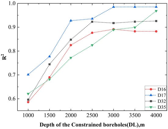 We performed a detailed investigation into the relationship between maximum borehole depth () and temperature prediction accuracy by selecting D12, D16, D17, D32, and D35 as constrained boreholes while maintaining at 0.15 m. Starting from 1000 m, we incrementally increased by 500 m intervals until reaching 4000 m, analyzing the prediction accuracy at each depth increment. The results demonstrate distinct patterns of depth-dependent accuracy across different boreholes (Figure 10). Most boreholes in our dataset have maximum depths around 3 km, with only D17 extending to 4 km. The flattening of prediction accuracy at 3 km for most boreholes is more reasonable than the continued improvement observed for D35. For boreholes D35 and D17, the prediction accuracy shows a positive correlation with up to 3 km, though D17 exhibits a notable stabilization around 97% accuracy when exceeds 3000 m. Similarly, boreholes D16 and D32 display a positive correlation between accuracy and in the 0–3 km range. Beyond 3 km, due to the limited control of our data, the accuracy of the prediction results above 4000 m is highly dependent on the extrapolation accuracy of the artificial neural network for three key parameters.