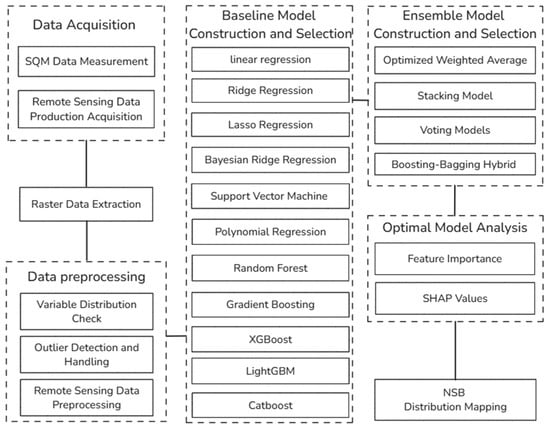 This study considers the target variable—NSB (SQM measurements)—as the dependent variable, with other features serving as independent variables. Various statistical and machine learning methods were used for data modeling and fitting (as shown in Figure 2). Cloud cover data in this study are derived from the VIIRS Bitmask dataset and are inherently ordinal, representing increasing levels of cloudiness. Because these data naturally follow an ordered scale, it is reasonable to incorporate them directly into linear regression models by treating them as continuous predictors, assuming that the intervals between categories are approximately equal. This approach is supported by established literature on ordinal data analysis, which demonstrates that under such assumptions, ordinal variables can effectively capture trends in the response variable [52,53]. The dataset was split into 70% for training and 30% for testing. To ensure the representativeness of the test set, the target variable distribution was balanced using the decile method.
