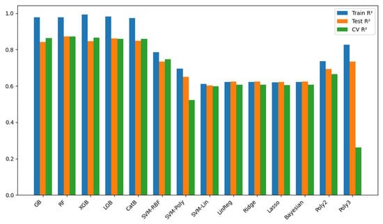 As shown in Figure 4 and Table A1, Tree-based models (GB, RF, XGBoost, LightGBM, and CatBoost) demonstrated the best overall performance, with test set R2 values approaching or exceeding 0.84, indicating strong generalization capabilities. Among them, RF exhibited the most stable performance, achieving a test set R2 of 0.873, an MSE of 0.228, an RMSE of 0.478, and an MAE of 0.313, highlighting its significant advantages in error control and stability. XGBoost achieved a test set R2 of 0.846, slightly lower than RF, but its training error was extremely low (R2 = 0.992), reflecting its strong fitting ability. Additionally, XGBoost achieved a cross-validation R2 of 0.866, demonstrating stable generalization performance on new data. GB achieved a test set R2 of 0.841, slightly inferior to XGBoost and RF, but still maintained good error control and a simple model structure. LightGBM achieved a test set R2 of 0.861, an MSE of 0.249, and an RMSE of 0.499, providing high accuracy while maintaining excellent training efficiency. CatBoost achieved an R2 of 0.848, with overall performance close to LightGBM, and is particularly suitable for handling large-scale datasets requiring fast modeling.