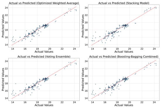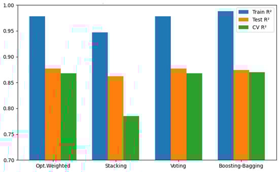 We combined the same five tree-based models in a voting regression setup, where each base model’s prediction was aggregated via a simple voting strategy. Our results showed consistency with the Optimized Weighted Averaging method, indicating that a straightforward voting scheme can also align with more refined weighting approaches.