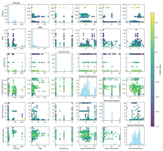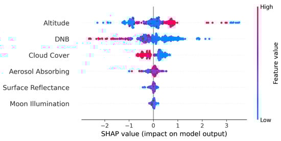SHAP (SHapley Additive exPlanations) analysis provides a quantitative basis for understanding the contributions of variables to the outputs of the predictive model [59]. As shown in the SHAP summary plot (Figure 7), altitude, DNB, and cloud cover have the most significant impacts on model outputs. Specifically, the SHAP values for DNB increase with brightness, indicating that in areas with severe artificial light pollution, higher nighttime light intensity makes a substantial positive contribution to the predictions. However, this effect plateaus beyond a certain brightness threshold, suggesting a marginal saturation effect of nighttime lighting. The impact of the aerosol absorption index follows a nonlinear pattern: its contribution to predictions is minimal at low concentrations but becomes significantly negative at higher concentrations, highlighting the critical role of atmospheric particles in attenuating light propagation. The influence of surface reflectance is most pronounced in the range of 0.45 to 0.55, where it contributes positively to predictions, while its impact diminishes outside this range.