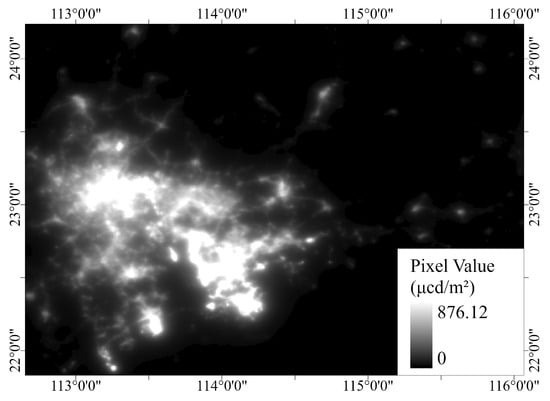 Nighttime lighting data were obtained from the NPP-VIIRS nighttime light remote sensing dataset, provided by the Earth Observation Group (EOG), with a resolution of 15 arcseconds (approximately 500 × 500 m) and radiance units of nW/cm2/sr, accurately capturing artificial light source radiative intensity [45,46].