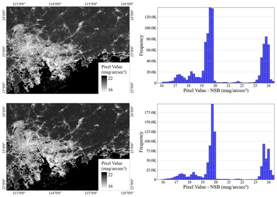 The NSB distribution map captures the long-distance impacts of artificial light sources on surrounding areas. In comparative analysis, while NPP-VIIRS imagery effectively identifies regions with dense light sources, it underrepresents the enhancement in sky brightness caused by long-distance light scattering (e.g., atmospheric scattering and aerosol reflection). In contrast, the NSB distribution map demonstrates a significantly larger extent of light pollution, highlighting its superior sensitivity in depicting the long-distance effects of light sources.