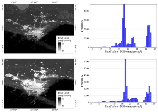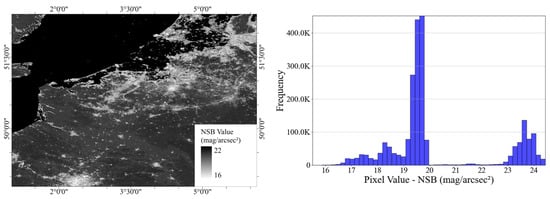 The histogram of NSB pixel values exhibits a bi-modal to trimodal pattern, with one prominent cluster around 19 mag/arcsec2 and another around 24 mag/arcsec2. A smaller group of pixels appears between 16–17 mag/arcsec2, in-dicating the brightest regions (i.e., heavily light-polluted urban cores). In contrast, values near 24 mag/arcsec2 signify exceptionally dark skies, often found in areas with minimal artificial lighting such as remote rural regions, deserts, or open seas. The mid-range cluster (~19 mag/arcsec2) represents moderately bright skies, where scattered suburban lights or partial cloud/aerosol contributions lead to intermediate NSB levels. This bimodal phe-nomenon can be explained by two major factors: first, even on a local scale, heavily illuminat-ed areas remain relatively small compared to vast regions with minimal or no artificial lighting, thus generating a clear high-value peak. Second, many rural or suburban areas experience moderate nighttime brightness (often influenced by cloud reflection and diffuse illumination), forming the second peak around 19 mag/arcsec2. These distinct peaks are further reinforced by the dynamic interplay of atmospheric aerosols, cloud coverage, and surface reflectance, which collectively shape the broad range of observed NSB values.