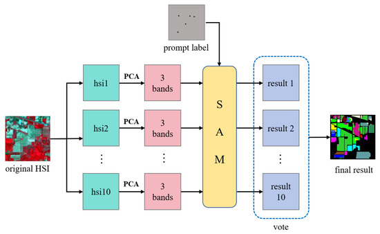 To ensure the validity of the SAM classification, a voting strategy has been implemented during the classification process. This procedure is illustrated in Figure 4. The foundation of the voting strategy is based on a multi-projection integration approach. The spectral bands of hyperspectral data are segmented into 10 continuous sub-bands, with each sub-band group independently subjected to principal component analysis (PCA) to produce 10 sets of pseudo-RGB images. Each set of pseudo-RGB images subsequently generates an independent classification result following inference by the SAM. Specifically, for each sub-band projection image, the model outputs a classification mask of size H × W that corresponds to the spatial dimensions of the original hyperspectral data, indicating pixel category predictions for that particular projection. For every pixel, we tally the number of times it is predicted to belong to each category across all projections and select the category with the highest vote count as its final classification. The advantage of this voting strategy lies in its ability to effectively reduce errors that may arise from relying on a single projection. Given that the spectral characteristics inherent in hyperspectral data can vary significantly across different bands, a solitary projection may not adequately capture all discriminative features present within the data.