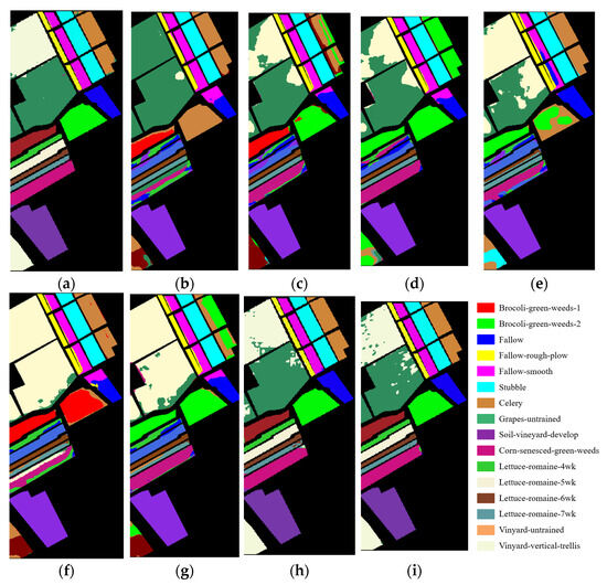 Classification outcomes of various methodologies applied to the SA dataset. (a) SAM; (b) SVM; (c) 1D-CNN; (d) 2D-CNN; (e) 3D-CNN; (f) SSRN; (g) HybridSN; (h) DFSL; (i) transformer.