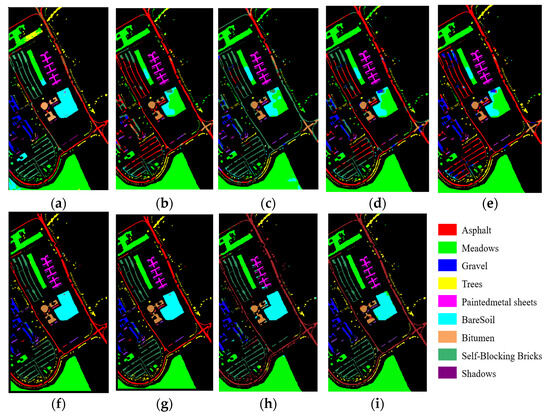Results of various classification methods applied to the PU dataset. (a) SAM; (b) SVM; (c) 1D-CNN; (d) 2D-CNN; (e) 3D-CNN; (f) SSRN; (g) HybridSN; (h) DFSL; (i) transformer.