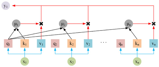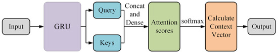 Attention scores represent the importance of each past time step in predicting the current output. The scores indicate which previous observations should contribute more or less to the model’s understanding of the data. Computing attention scores allows the model to weigh historical data effectively and focus on the most relevant information [44]. The attention scores are computed by taking the dot product of the query and key vectors, followed by applying a function to normalize the scores. This process ensures that the attention weights are positive and sum to 1, emphasizing the most relevant past information. Attention scores are computed as follows: