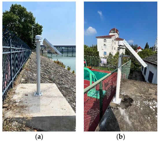 The experiment was conducted at the Sanhe Sluice of Hongze Lake, Jiangsu, China, a critical location for hydrological monitoring, as shown in Figure 4. The experimental period spanned from 10 September 2023, to 10 September 2024, covering a full year to capture seasonal variations. During this time, multi-constellation GNSS signals were utilized, including BeiDou (B1I, B2I), Galileo (E1B/C, E5b), and GPS (L1C/A, L2C), with a sampling frequency of 1 Hz to ensure high temporal resolution and precise data collection. This setup enabled comprehensive analysis and evaluation of the GNSS’ performance in real-world conditions.