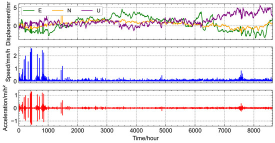 As shown in Figure 5, the first subfigure presents the GNSS displacement over time. Due to the use of an imperfect positioning strategy at the initial stage, the first 1000 h of data exhibit a high number of abrupt outliers, with displacement variations reaching up to 5 mm. After refining the positioning strategy, the accuracy of the results improved significantly. In the velocity subfigure, a similar pattern is observed, where frequent outliers appear within the first 1000 h, with variations reaching up to 2 mm/h. Additionally, there are minor fluctuations around the 1500th hour and 7500th hour marks, but the velocity remains relatively stable during the rest of the time. The acceleration subfigure follows the same trend, with the most abrupt outliers in the first 1000 h, where variations reach 1 mm/hour2. Small fluctuations also occur near the 1500th hour and 7500th hour marks, but the overall acceleration is stable beyond these periods. This figure effectively highlights the initial phase of noise and the overall data stability after the correction of the positioning strategy.