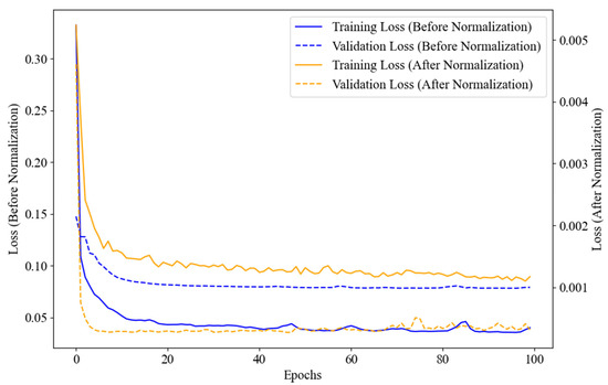 Figure 6 presents the loss diagram of the normalization and originals, which contains four curves. For the original data, the training loss curve initially rises to 0.25 and then stabilizes around the 10th epoch. However, frequent fluctuations occur between the 10th and 50th epochs. The test loss curve for the original data shows a similar trend, rising to 0.025 initially, then stabilizing around the 10th epoch, but it also exhibits frequent fluctuations between the 10th and 50th epochs. In contrast, after normalization, the training loss curve converges smoothly from 0.005 to 0.0008 within the first 7 epochs and remains stable without the fluctuations observed before normalization. Similarly, the test loss curve for the normalized data converges from 0.004 to 0.0003 within the first 7 epochs, maintaining stability afterward. This figure clearly illustrates the significant improvement in convergence and stability achieved through GNSS data normalization.