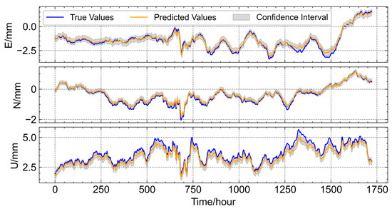 Figure 8 shows the performance of the GRU–Attention model on the test dataset. GRU is configured with 1024 hidden units, while the Autoregressive Attention mechanism uses 32 units. The model demonstrates strong overall performance across the various directional components. In the east (E) direction, the predicted results align well with the actual observations, with only minor discrepancies observed around the 650th and 1500th hours. The performance in the north (N) direction is comparable to the E direction but shows a slight improvement, with a small deviation occurring near the 700th hour. In contrast, the performance in the up (U) direction is relatively weaker, although the predicted time series closely follows the trend of the original observations. Discrepancies of approximately 0.5 mm are noted in several intervals, such as between the 500th and 600th and 1200th and 1400th hours. These differences highlight the challenges of accurately predicting vertical displacements and suggest potential areas for further model refinement, such as integrating additional sensor data or enhancing feature extraction techniques to improve performance in the three directions. In summary, the proposed GRU–Attention model exhibits high prediction accuracy across all directions, with the N direction showing the best performance and the U direction exhibiting minor differences from the actual measurements.