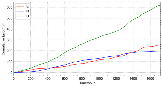 Figure 9 illustrates the cumulative error in the test dataset for each directional component. Both the E and N directions demonstrate relatively low cumulative errors. The linear fit slope for the E direction is approximately 0.15, indicating a gradual increase in cumulative error over time. Similarly, the N direction shows a linear fit slope of about 0.11, with the cumulative error curve exhibiting a slightly higher magnitude than the E direction between the first 1400 h but falling below the E direction after the 1400 h interval. In contrast, the U direction displays a significantly larger cumulative error, with a linear fit slope of around 0.36. The cumulative error curve for the U direction is notably higher than that of both the E and N directions throughout the entire test period.