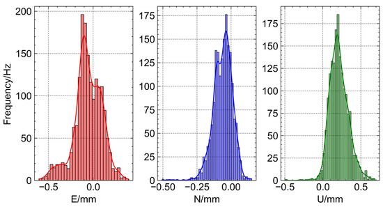 Figure 10 presents the error distribution histograms for the test set across the E, N, and U directions, revealing distinct characteristics in each direction. In the E direction, errors generally follow a normal distribution with a central value of approximately −0.1 mm and a range from −0.6 mm to 0.3 mm. Most data points are concentrated between −0.3 mm and 0.3 mm, with only a small portion falling between −0.6 mm and −0.3 mm. The N direction shows an even closer alignment to a normal distribution, with a central value around −0.1 mm and a range from −0.6 mm to 0.2 mm. Errors are predominantly within −0.2 mm to 0.2 mm, with few outliers between −0.6 mm and −0.2 mm. In contrast, the U direction exhibits a broader error distribution, with a central value of about 0.2 mm and a range from −0.1 mm to 0.9 mm. Most errors are concentrated between −0.1 mm and 0.6 mm, while some extend into the 0.6 mm to 0.9 mm range. Overall, while the E and N directions demonstrate relatively narrow error ranges and better adherence to normal distributions, the U direction shows larger deviations and a wider spread, highlighting greater challenges in vertical measurements.