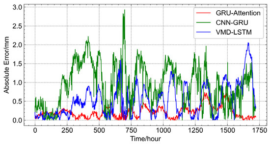 Figure 11 illustrates the absolute error distribution of the three models in the test dataset for three-dimensional displacement prediction. The GRU–Attention model, represented in red, exhibits the best overall performance, maintaining the smallest fluctuation range. Its maximum error reaches approximately 0.7 mm within the 1250 to 1500 h interval, demonstrating stable and consistent predictions. The VMD-LSTM model, shown in blue, performs moderately well but exhibits frequent fluctuations throughout the test interval, with its largest deviation reaching around 2 mm near the 1600 h mark. The CNN-GRU model, represented in green, performs the worst, with fewer fluctuations compared to VMD-LSTM but exhibiting a maximum deviation of approximately 2.9 mm around the 700 h interval. Overall, the results indicate that the GRU–Attention model provides the most stable and accurate predictions, effectively minimizing errors and maintaining consistency. The VMD-LSTM model demonstrates moderate accuracy but suffers from frequent fluctuations, while the CNN-GRU model exhibits the largest deviations, highlighting its limitations in multi-step displacement forecasting. These findings further confirm the superior predictive capability of the GRU–Attention model in deformation monitoring applications.