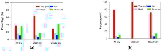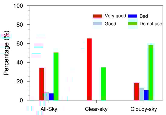 For the Fengyun-4B/GIIRS AHP products, all pixels are categorized as “very good” under the clear-sky condition, which means that the NSMC is confident in the quality of the product under the clear-sky condition. As shown in Figure 1b, under the cloudy-sky condition, the percentage of “very good” reduces from 100% to 74.21%, while the percentage of “bad” or “do not use” increases from 0 to 25.79%. Overall, from March 2023 to January 2024, 86.55% of the Fengyun-4B/GIIRS AHP products are flagged as “very good” or “good”, and 13.45% of the products are flagged as “bad” or “do not use”, which are not recommended for use. Compared to the Fengyun-4B/GIIRS ATP products, the usability of AHP products is better under both clear-sky and cloudy-sky conditions, which suggests that the influence of clouds on the retrieval of temperature profiles is larger than that on the retrieval of humidity profiles.