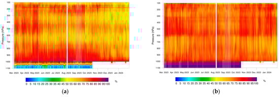 The vertical and temporal distributions of the percentages for the usable Fengyun-4B/GIIRS ATP and AHP products (quality flags with values of “very good” or “good”) are shown in Figure 3. As shown in Figure 3a, from March 2023 to January 2024, the percentage of usable Fengyun-4B/GIIRS ATP products below 1050 hPa is significantly lower than those of other vertical levels, which is caused by the interference of the surface to the Fengyun-4B/GIIRS long-wave infrared observations, leading to uncertainty in temperature profile retrieval. After mid-October 2023, the NSMC updated the operational retrieval strategy and provided the missing values below 1050 hPa of the retrieval result. On the contrary, the percentage of usable Fengyun-4B/GIIRS AHP products below 1050 hPa is close to 100%, which suggests that the retrieval process of humidity profiles is negligibly influenced by the surface. For the vertical levels over 1050 hPa, the usability of Fengyun-4B/GIIRS ATP and AHP products mainly varies from 50% to 95%.