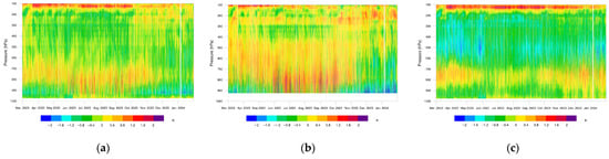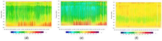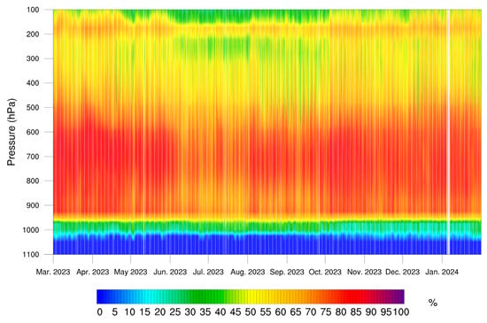 For comparison, Figure 4 shows the percentage distributions of the usable operational Fengyun-4A/GIIRS ATP products. A significant boundary line is observed at about 950 hPa, and the percentage below 950 hPa is significantly lower than those of the other levels, which is similar to the phenomenon in Figure 3a, but the boundary line is higher for the Fengyun-4B/GIIRS ATP products, which suggests that the Fengyun-4B/GIIRS ATP products suppress the noise information from the surface more efficiently. For products between 500 hPa and 950 hPa, the percentage of usable Fengyun-4B/GIIRS and Fengyun-4A/GIIRS ATP products is similar, but above 500 hPa, the percentage of usable Fengyun-4B/GIIRS ATP products is larger than that of Fengyun-4A/GIIRS ATP products. Overall, due to the improvement in radiometric and spectral calibration accuracy (from 1.5 K to 0.8 K and from 10 ppm to better than 10 ppm []), the usability of the Fengyun-4B/GIIRS ATP products is better than that of the Fengyun-4A/GIIRS ATP products, especially from 100 hPa to 500 hPa and from 950 hPa to 1050 hPa.