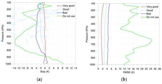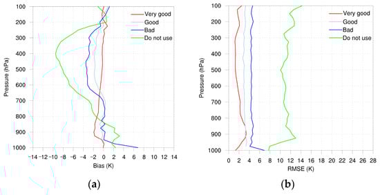 Figure 5 shows the vertical distribution of biases and RMSEs between Fengyun-4B/GIIRS ATP products and radiosonde observations. As shown in Figure 5a, the biases of the Fengyun-4B/GIIRS ATP products with the quality flag of “very good” vary from −0.837 K to 0.192 K. For products flagged as “good”, biases are mainly negative, except from 900 hPa to 825 hPa. The biases of products flagged as “bad” and “do not use” are positive below 900 hPa; then, they turn negative above 900 hPa. From Figure 5b, the differences in the RMSE for the vertical distribution of products with four quality flags are evident. The RMSEs for products flagged as “very good”, “good”, and “bad” are around 1.5 K, 3 K, and 4.5 K, respectively, but for products flagged as “bad”, the variation range of RMSEs is quite large, varying from 10.065 K to 24.570 K. By comparing Figure 5a and Figure 6a, it is evident that the vertical distribution of biases for the Fengyun-4B/GIIRS ATP products flagged as “very good” is more stable than that for the Fengyun-4A/GIIRS ATP products and is around 900 hPa, and the biases of the Fengyun-4A/GIIRS ATP products can be over 1.9 K. The RMSEs of the Fengyun-4B/GIIRS and Fengyun-4A/GIIRS ATP products flagged as “very good”, “good”, and “bad” are close, except for the RMSEs of products flagged as “very good” around 900 hPa and flagged as “good” around 1000 hPa.