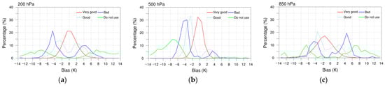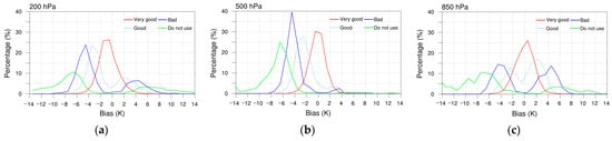 The values of 200 hPa, 500 hPa, and 850 hPa are normally selected to represent the high-level, middle-level, and low-level troposphere, respectively. The percentage distributions of the biases between Fengyun-4B/GIIRS ATP products, Fengyun-4A/GIIRS ATP products, and radiosonde observations at 200 hPa, 500 hPa, and 850 hPa are presented in Figure 7 and Figure 8, respectively. For the products flagged as “very good”, the percentage distributions of biases are all unimodal and basically have a symmetric structure at 200 hPa, 500 hPa, and 850 hPa. For the product flagged as “good” or “bad”, the percentage distributions of biases mainly have a bimodal structure, which can be improved by using the bias correction method. For the products flagged as “do not use”, the percentage distributions of biases are discrete.