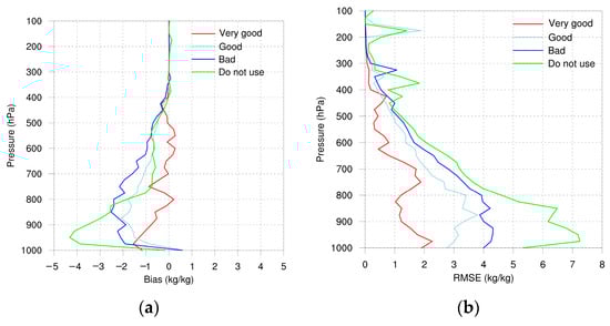 The vertical distribution of biases and RMSEs between the Fengyun-4B/GIIRS AHP products and radiosonde observations is presented in Figure 9. As shown in Figure 9a, the biases of the Fengyun-4B/GIIRS AHP products are mainly negative regardless of the quality flags, indicating that systematic underestimation exists in the Fengyun-4B/GIIRS AHP products. The difference in the RMSE vertical distribution for products with four quality flags is evident, and the RMSE for products flagged as “very good” or “good” is lower than that of the other two categories, which indicates that the current quality flag classification algorithms can effectively identify the high-quality retrieval results.
