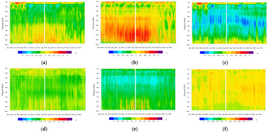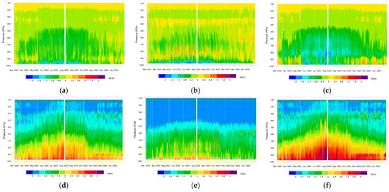 Vertical and temporal distributions of (a–c) biases and (d–f) RMSEs between the Fengyun-4B/GIIRS ATP products and the ERA5 reanalysis under the (a,d) all-sky, (b,e) clear-sky, and (c,f) cloudy-sky conditions.