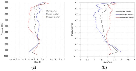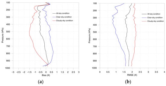 Figure 13 presents the vertical distribution of biases and RMSEs between the Fengyun-4A/GIIRS ATP products and the ERA5 reanalysis. As shown in Figure 13a, biases under the all-sky, clear-sky, and cloudy-sky conditions are all negative below 800 hPa and then increase to become positive, which is different from the vertical bias distributions shown in Figure 12a. In Figure 13a, there is a jump change in biases over 150 hPa, and a similar phenomenon is also evident in Figure 12a, suggesting that a similar problem exists in the retrieval process of Fengyun-4A/GIIRS and Fengyun-4B/GIIRS ATP products, which should be improved by algorithm developers. In the comparison of Figure 12b and Figure 13b, the variation range of RMSE under the clear-sky condition is larger than that under the cloudy-sky condition, which suggests that the current operational retrieval algorithm may mistakenly include cloudy pixels in the retrieval process of ATP products under the clear-sky condition.