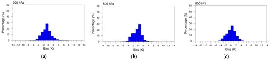 Percentage distributions of biases between Fengyun-4A/GIIRS ATP products and radiosonde observations at (a) 200 hPa, (b) 500 hPa, and (c) 850 hPa.