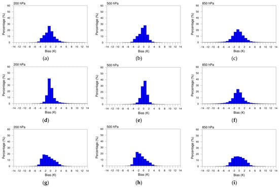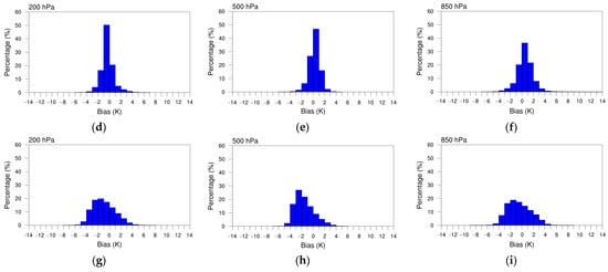 For the Fengyun-4A/GIIRS ATP products, 69.8%, 77.8%, and 66.1% of samples matched under the all-sky condition, and biases are between −2 K and 2 K. Similar to the Fengyun-4B/GIIRS ATP products, the quality of Fengyun-4A/GIIRS ATP products at 500 hPa is better than that at other two pressure levels. By comparing Figure 14d–f and Figure 15d–f, it is evident that the percentage distributions of biases under the clear-sky condition at 200 hPa and 500 hPa are similar, but at 850 hPa, the percentage distributions of biases for the Fengyun-4A/GIIRS ATP products are wider, which may result from surface noise.
