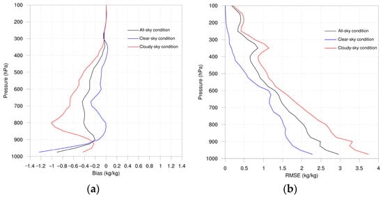 As shown in Figure 16a, the Fengyun-4B/GIIRS AHP products mainly underestimate the atmospheric humidity condition under the all-sky condition. The biases are mainly from −0.8 kg/kg to −0.4 kg/kg below 500 hPa and from −0.4 kg/kg to 0.4 kg/kg above 500 hPa. Under the cloudy-sky condition, the underestimation of Fengyun-4B/GIIRS AHP product is even more severe. Especially around 850 hPa, biases can be over −1.2 kg/kg. Due to the vertical distribution of water vapour in the atmosphere, the vertical stratification phenomenon of RMSEs is very evident (Figure 16d–f), and the RMSEs decrease with the decreasing pressure. By comparing Figure 16e,f, it is evident that the vertical stratification phenomenon is more stable and has weaker seasonal variability under the clear-sky condition than under the cloudy-sky condition, and the boundaries of vertical stratification move upward in the summer and downward in the winter.