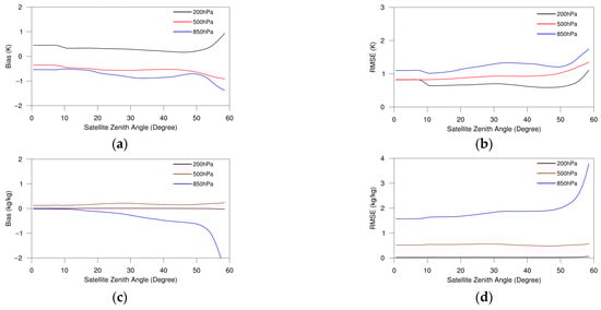 As shown in Figure 18c,d, biases and RMSEs between Fengyun-4B/GIIRS AHP products and ERA5 reanalysis at 200 hPa and 500 hPa have a negligible relationship with the satellite zenith angles. For biases at 850 hPa, they gradually increase with the satellite zenith angles when the angles are less than 50°, and then they significantly increase from −0.608 kg/kg to −2.507 kg/kg when the satellite zenith angles increase from 50° to 60°. The RMSEs at 850 hPa show similar variation patterns, in which they gradually increase at first and then significantly increase when the satellite zenith angles are above 50°.