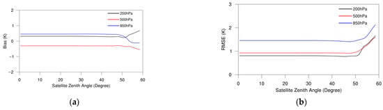 Since Fengyun-4B is a geostationary meteorological satellite, with the increase in the satellite scan angle, the optical depth between Fengyun-4B/GIIRS and Earth also increases, which may lead to uncertainty pertaining to the Fengyun-4B/GIIRS ATP and AHP products; thus, it is necessary to analyze their dependence on satellite scan angles. To exclude the effect of clouds and land surfaces, only matched samples over the ocean under clear-sky conditions are selected. Furthermore, 200 hPa, 500 hPa, and 850 hPa are selected to investigate the dependence at the high-level, the middle-level, and the low-level troposphere. Figure 18a,b present variations in biases and RMSEs between the Fengyun-4B/GIIRS ATP products and the ERA5 reanalysis with respect to satellite zenith angles calculated at 1° intervals. As shown in Figure 18a, biases at 200 hPa remain positive and biases at 500 hPa and 850 hPa remain negative at any satellite zenith angle. Biases at 200 hPa and 500 hPa have a negligible relationship with satellite zenith angles when the angles are less than about 50°, and then the biases decrease gradually when the satellite zenith angles are above 50°. For biases at 850 hPa, they decrease with the increase in the satellite zenith angles, and when the satellite zenith angles are more than 50°, the decreasing trend of bias is even more evident. The RMSEs at 200 hPa are maintained at about 0.82 K when the satellite zenith angles are less than 8°, and they decrease when the satellite zenith angles are between 8° and 11°. Similar variation patterns also exist for RMSEs at 850 hPa. When the satellite zenith angles are above 50°, the increase trends of RMSEs at 200 hPa, 500 hPa, and 850 hPa are more evident. For comparison, variations in biases and RMSEs between the Fengyun-4A/GIIRS ATP products and the ERA5 reanalysis with respect to the satellite zenith angles are presented in Figure 19. Biases and RMSEs are stable when the satellite zenith angles are less than 50°. When the satellite zenith angles are above 50°, the biases at 200 hPa, 500 hPa, and 850 hPa all exhibit a jump change, and the RMSEs at 200 hPa, 500 hPa, and 850 hPa all have a significant positive relationship with the satellite zenith angles.