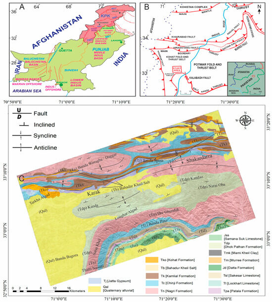 (A) Regional map of Pakistan showing the major provinces and basins. (B) Tectonic map of North Pakistan, showing the major structural features and towns, modified after [24]. (C) Geological map of the Kohat Quadrangle, Pakistan (adapted from reconnaissance geology maps at a scale of 1:250,000).