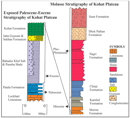 Composite stratigraphic column of the rocks of the Kohat Plateau; modified after [24].