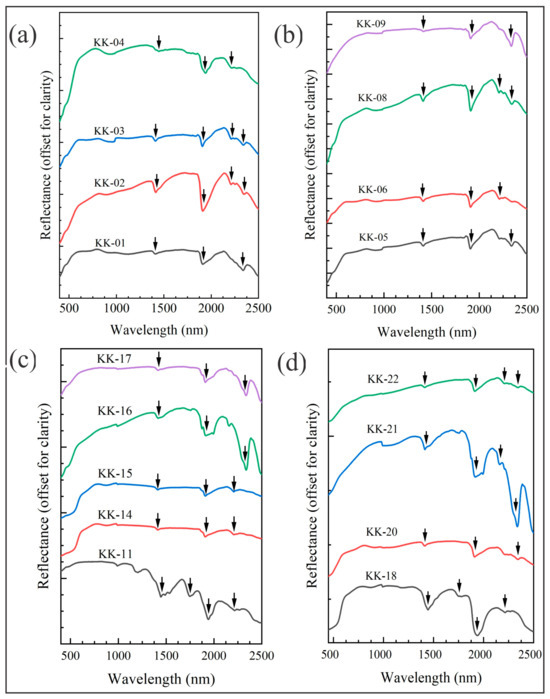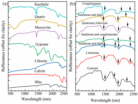 According to the alteration appearances of lithological units, the laboratory spectra of minerals, including kaolinite, illite, quartz, gypsum, muscovite, chlorite, and calcite, were extracted from the USGS spectral library to recognize the spectral features of the alteration in the working area to monitor the understanding of sample spectra and assist further hyperspectral mapping [34]. Each of the seven minerals shows diagnostic absorption features in the SWIR region with different absorption wavelengths (center) and strengths [35]. The limestone alteration exhibits absorption features around 2250 and 2350 nm induced by Co3+2 [36]. The advanced argillic alteration is characterized by kaolinite and alunite; kaolinite shows the diagnostic Al-OH features near 2165 and 2200 nm, whereas alunite has a strong absorption feature at 2170 nm and a weak absorption feature at 2320 nm caused by Al-OH [37].