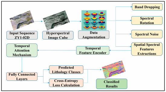 Mineral identification is one of the most successful applications of hyperspectral remote sensing to date, especially for minerals with simple structures and distinct spectral features, such as iron-containing minerals, mica group minerals, and carbonate minerals [1]. However, compared with mineral identification, lithology identification in regional geological surveys is a very fundamental yet important research direction. It not only helps researchers obtain rich geological information such as lithology, occurrence, and topography, but also provides significant assistance in analyzing stratigraphic age, geological structures, magmatic activities, and mineral distribution. For a long time, regional geological survey work mostly relied on geologists conducting field investigations, sampling and identifying outcrops of rock layers, and finally determining the types of surface lithology. This entire survey and identification process used to be very lengthy and required a substantial amount of manpower and resources [2]. Therefore, with the advent of remote sensing technology, especially hyperspectral remote sensing technology, the efficiency of geological surveys, lithology classification, and geological mapping has greatly improved. Numerous researchers have used hyperspectral technologies to identify lithology in previous studies. For instance, ref. [3] identified lithology–structure correlations and extracted geological structural information from hyperspectral images (HSIs). The findings showed that HSIs may successfully distinguish between various geological units and pinpoint the features of the geological formations’ spatial distribution. Similarly, ref. [4] used HSIs surrounding the Talin uranium deposit to categorize lithology using convolutional neural networks (CNNs). The results showed a good classification performance.