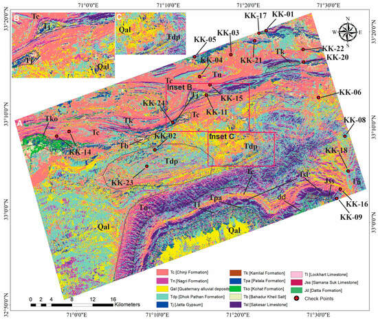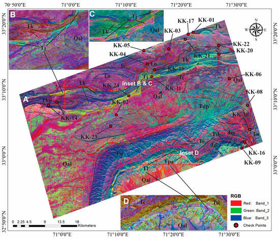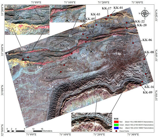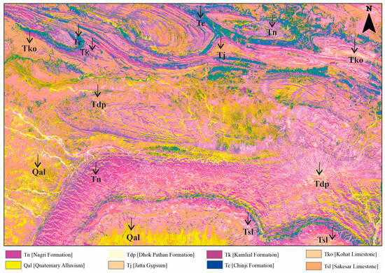 False color composite images can be used to enhance and reveal important lithological differences and alteration zones [10,11,32]. The false color composite of three bands, i.e., 116, 148, and 156 (1644.0, 2199.48, and 2334.19 nm) in red, green, and blue (RGB) spectral channels can enhance the visual representation of rocks with limestone and gypsum alteration. The Earth’s surface is frequently decrypted using several color combinations of satellite images obtained in the VNIR, SWIR, and TIR spectral bands. Using an additive RGB model, FCC is among the finest methods for interpreting raster data acquired in various electromagnetic spectrum ranges (both visible and invisible) [38]. The primary purpose of color composites from the Landsat data collection is to identify different kinds of geological elements, including rocks, vegetation, and water bodies [39,40]. A false color composite (FCC) is made for lithological mapping by combining a number of spectral channels that are collectively less correlated and represent distinct spectral properties of absorption and reflection of various rocks and minerals [41]. The received spectral channel combinations allow for the separation of areas with distinct minerals, lithological variations, and structures, which are represented by varying colors and gradients on the resulting FCC image [39]. The same combination’s color spectrum may vary depending on the region under study, which is influenced by the various sedimentation conditions and rock mineral compositions [42]. For the framework of our study, a false RGB composite from 116, 148, and 156 bands of the ZY1-02D data was selected, which is the most informative for regional mapping of different geological formations within the Kohat–Pothohar Plateau.