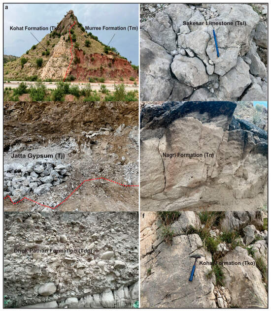- Meissner, C.R.; Master, J.M.; Rashid, M.A.; Hussain, M. Stratigraphy of the Kohat Quadrangle, Pakistan; U.S. Government Publishing Office: Washington, DC, USA, 1974. [Google Scholar]