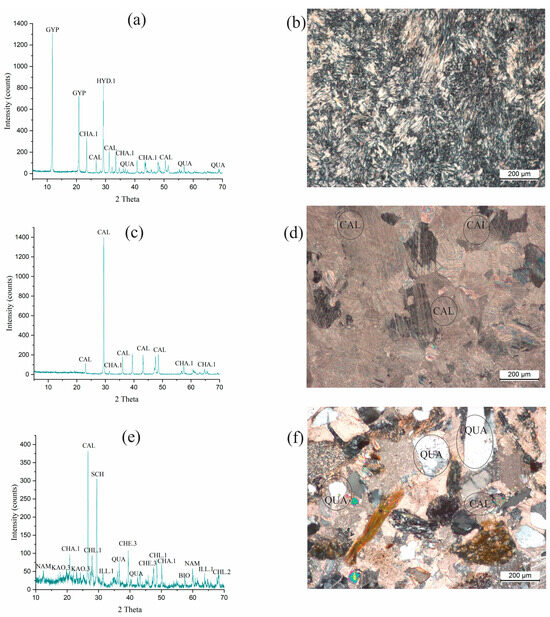 XRD patterns and photomicrographs of the target samples. (a) Gypsum (GYP) as the main phase. (b) Photomicrograph of a selected sample displaying gypsum. (c) Calcite (CAL) in abundance. (d) Calcite in a photomicrograph of a selected sample. (e) Calcite (CAL) as the main phase with quartz (QUA) and chlorite (CHL). (f) Photomicrograph of a selected sample displaying quartz and calcite.