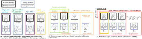 Concept comparison between different settings. (a) Concept comparison on a class level. Single-task learning: Both training and test samples are drawn from the same distribution . The model is trained and evaluated on data with identical characteristics and class labels. Open-set/Open World/Out-of-Distribution (OOD) settings: The model is trained on known classes but must identify and mark novel classes as ’unknown’ during testing. This setting focuses on detecting out-of-distribution samples without requiring specific classification of novel classes. Zero-shot setting: The model is trained on base classes but must classify novel classes into specific categories during testing. This is achieved by leveraging predefined word embeddings that describe the novel classes. Open-vocabulary setting: The model is trained on base classes B but can classify novel classes N during testing by utilizing large-scale language vocabulary knowledge instead of predefined word embeddings. This setting emphasizes the use of external linguistic knowledge to generalize to unseen classes. (b) Concepts comparison on a domain level. Domain adaptation setting: The model is trained on a source data distribution and adapts to an unseen target distribution by accessing unlabeled or limited labeled target data during training. Domain generalization setting: The model is trained on one or more source distributions and evaluated directly on an unseen target distribution without any adaptation. The goal is to achieve robust performance across diverse domains. (c) Open vocabulary domain generalization setting: The model is trained on base classes from one or more source distributions and must generalize to any unseen target distribution , where Y contains both base classes and novel classes . This setting combines the challenges of domain generalization and open-vocabulary learning.
