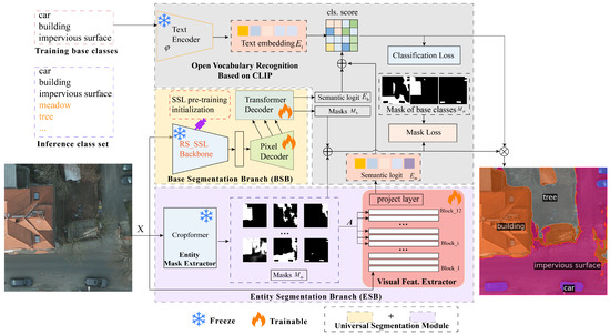 The proposed universal segmentation module comprises two branches: a base segmentation branch (BSB)and an entity segmentation branch (ESB). Firstly, the diversity and completeness of extracted masks are pivotal factors influencing model performance in semantic segmentation. However, segmentation models trained on base classes often exhibit category bias, as novel classes are typically perceived as background and thus suppressed. Consequently, the mask proposal generator fails to truly achieve class-agnostic mask extraction, tending instead to extract masks corresponding to base classes. Even when unmatched candidate masks do not contribute to loss computation during training, this tendency persists. Moreover, due to disparities in data style between the target and source domains used for training, segmentation models trained on a specific data domain may exhibit sensitivity to stylistic differences in the target domain, leading to suboptimal outcomes. Hence, we endeavor to enhance model robustness and reduce sensitivity to data styles by incorporating dual branches (BSB and ESB). The BSB excels at segmenting the base classes in supervised learning. However, the single-branch BSB extracts very few masks for novel classes, resulting in low recall rates. Therefore, integrating an ESB is necessary to bolster mask extraction capabilities, especially for novel classes, by generating more universal masks.