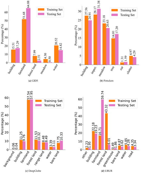 We evaluate the proposed methods on four well-known remote-sensing datasets: (1) Potsdam [1] dataset is a widely used benchmark in remote sensing, comprising 38 images of size 6000 × 6000 pixels. It includes six classes, with ’background’ as one of them. (2) GID5 [84] contains 150 pixel-level annotated GF-2 images of 6800 × 7200, sampled from various cities in China. It has a total of 5 classes. (3) DeepGlobe [85] is a large-scale land-cover dataset that contains 803 images (2448 × 2448 pixels). It includes seven classes of landscape regions, including “unknown” regions. (4) URUR [86] features a substantial number of high-resolution images (3008 images of size 5120 × 5120 pixels) covering a wide range of complex scenes from 63 cities. In the open-vocabulary setting, we first remove the “clutter” class from Potsdam, the “background” class from DeepGlobe, and the “other” category from URUR by setting the corresponding labels to 255, marking them as invalid classes. Next, we merge similar classes across datasets. For instance, categories such as “built up”, “building”, and “urban land” are unified and renamed as “building”. Finally, we randomly partition the classes into base and novel classes across all datasets. We combine the four datasets into a single dataset, referred to as GPDU, comprising a total of 12 classes. These include seven base classes (building, farmland, forest land, impervious surface, car, range land, greenhouse) and five novel classes (meadow, water, tree, bare land, road). The details of class partitioning and the class mapping relationships can be found in Table 1. The class frequency distributions on the training and testing sets of the four datasets are illustrated in Figure 3.
