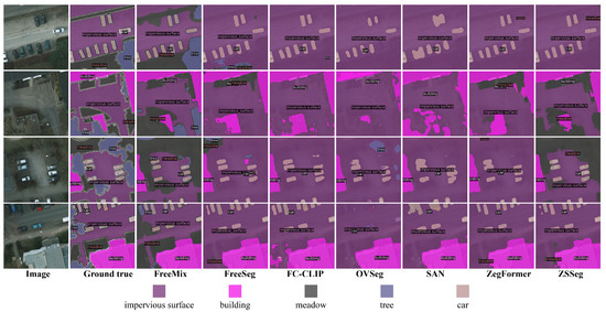 Our proposed FreeMix is compared against several existing open-vocabulary methods, including ZSSeg [51], ZegFormer [16], MaskCLIP [19], SAN [52], OVSeg [23], FC-CLIP [90] and FreeSeg [24]. In the open-vocabulary setting, the model is trained using only base classes and their corresponding masks. During testing, both base classes and novel classes are evaluated to assess the model’s generalization capability. Table 2 shows the results on the Potsdam dataset. For a fair comparison, all models use ResNet50 as the image encoder, with the exception of OVSeg, which uses ResNet101, and FC-CLIP, which employs a large version of ConvNeXt. The proposed FreeMix significantly outperforms other methods across multiple evaluation metrics. Specifically, it achieves the highest mean Intersection over Union (mIoU) of 63.44% and the highest mean pixel Accuracy (mACC) of 73.87%, both of which are the best among all compared methods. Notably, FreeMix excels in segmenting base classes, achieving an mIoU of 86.46%. This high score underscores its proficiency in accurately delineating familiar object categories. Additionally, for novel classes, FreeMix attains an mIoU of 28.92%. Although this is lower than the performance in base classes, it still represents a commendable achievement considering the inherent challenges of recognizing previously unseen categories. These results collectively demonstrate that FreeMix not only maintains high accuracy for known classes but also generalizes well to novel classes, highlighting its robustness and adaptability in open-vocabulary semantic-segmentation tasks.